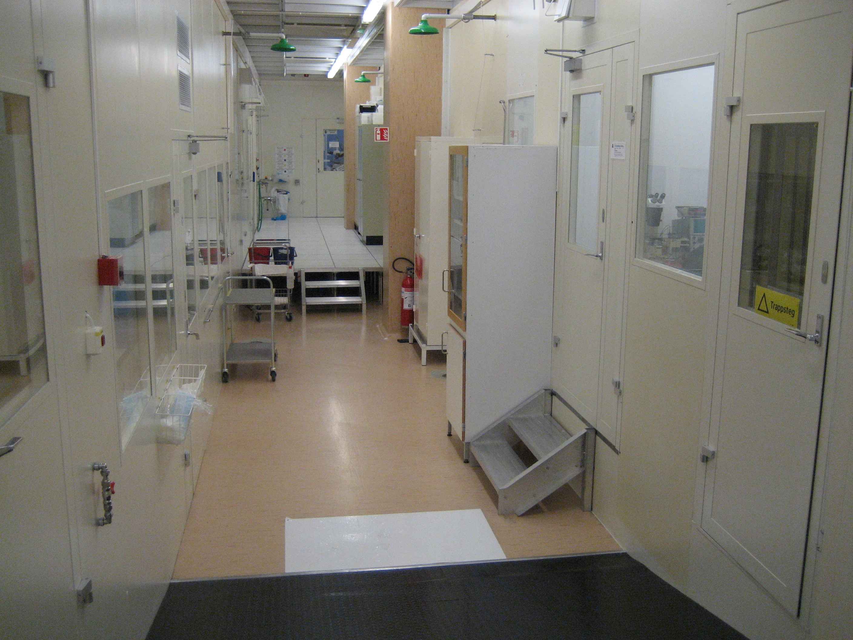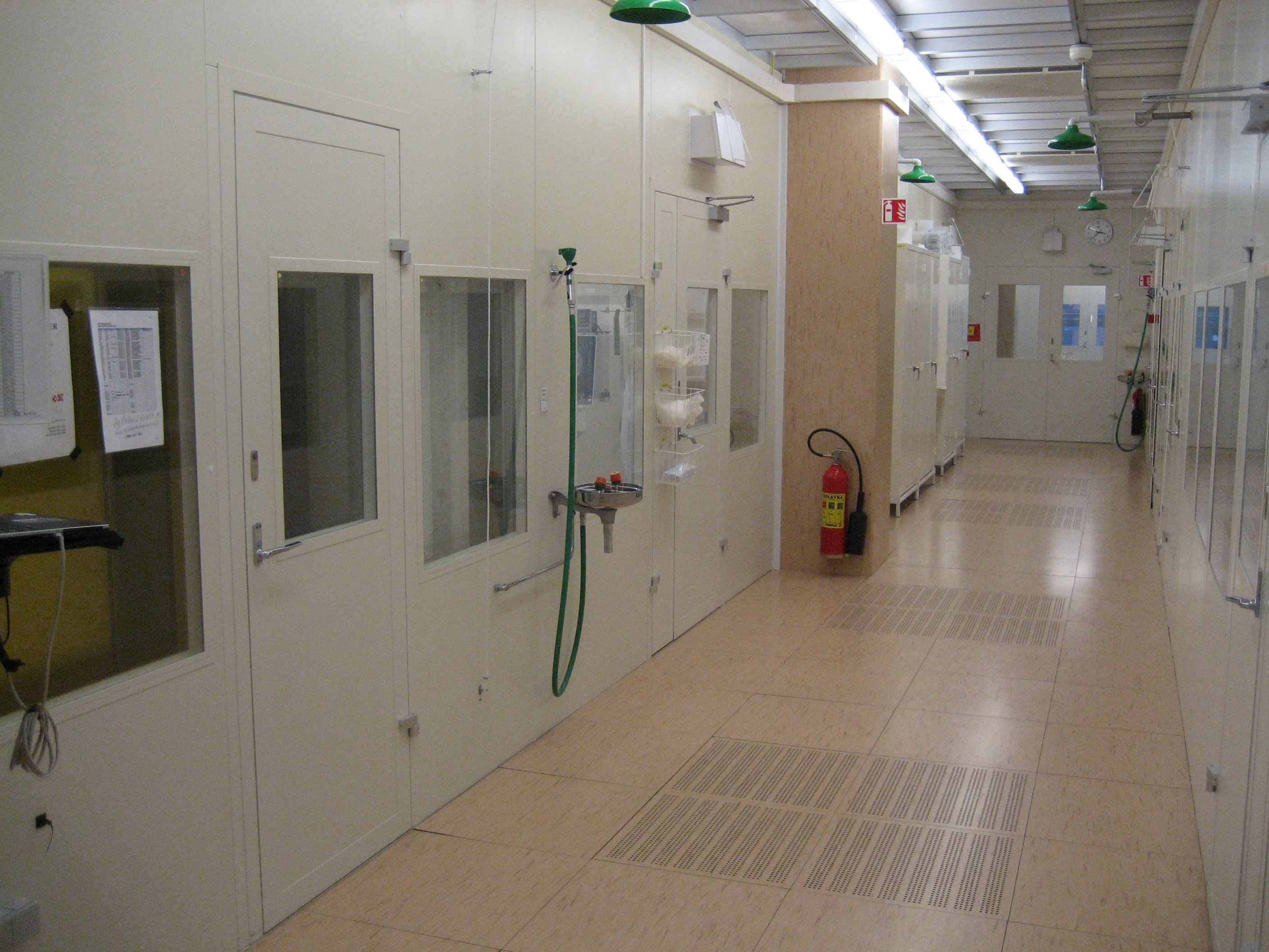 This is a main clean room corridor. You can go to the left or to the right or enter some of the doors. |